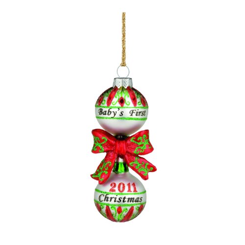 Rich classic hues and traditional patterns grace this Marquis by Waterford Baby's First Christmas 2011 ornament. The blown glass and hand painting gives this ornament a unique look that will bring a little sparkle to any Christmas tree.
