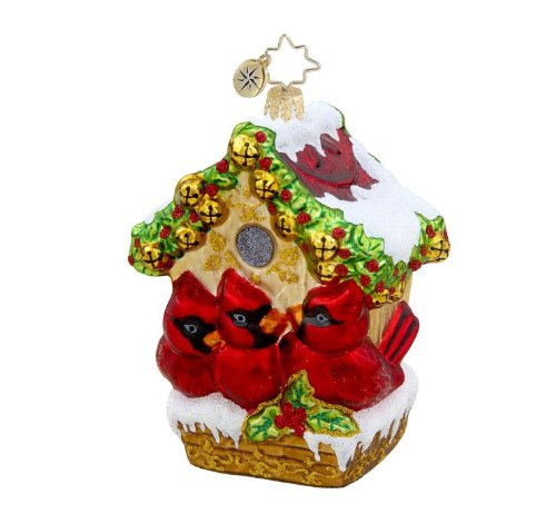 "Jingle Bell Hideaway"4.25 " Glass Ornament NEW Beautiful red Cardinal birds in front of their birdhouse adorned with bells, with glitter accents- hand painted in Poland. This ornament is new with original tag. Christopher Radko gorgeous all glass hand-blown Ornaments. Each is a work of art! Exquisite workmanship and handcrafted details are the hallmark of these creations. Made the old fashioned way, hand-blown in Europe, filled with silver to provide strength and luminenscence and hand-painted. Christopher Radko ornaments make wonderful heirloom collectibles for you and your friends. Radko ornaments are only available for a limited time, styles are "retired" annually.Item is NEW - packed in a Christopher Radko Gift Box!